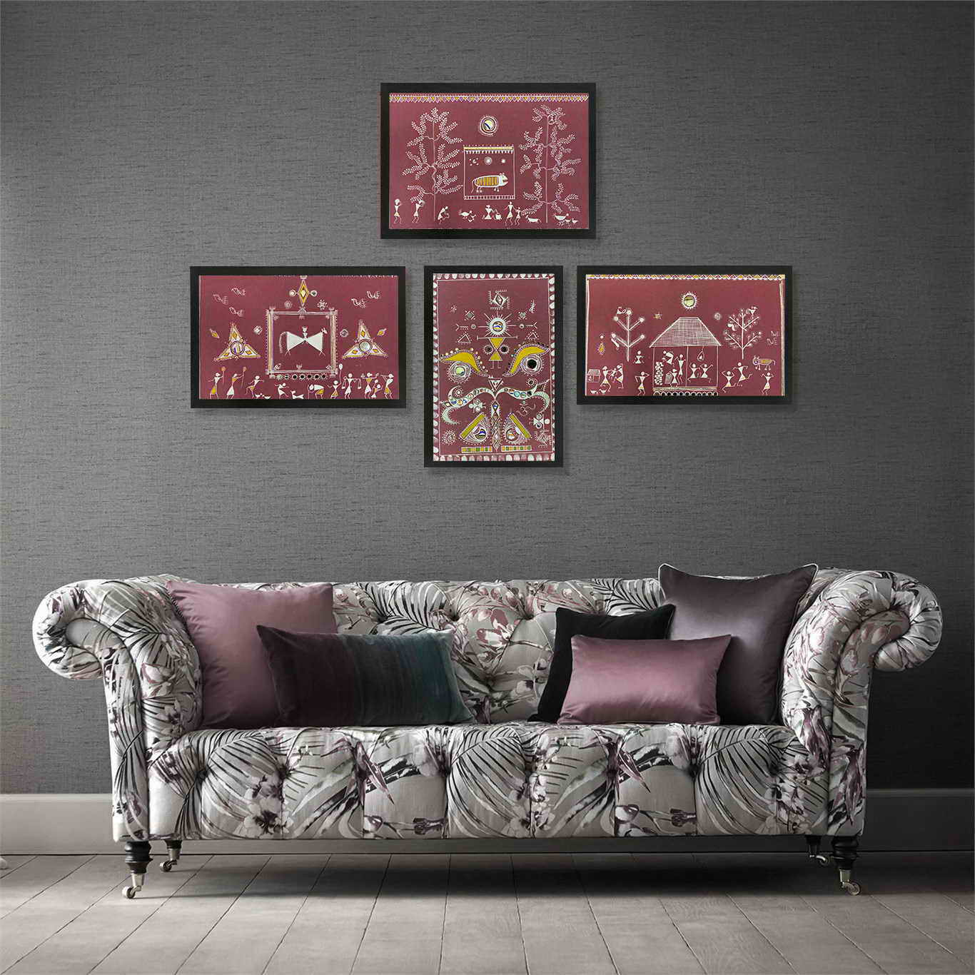 A maroon warli painting on paper depicting Indian arts and handicrafts.