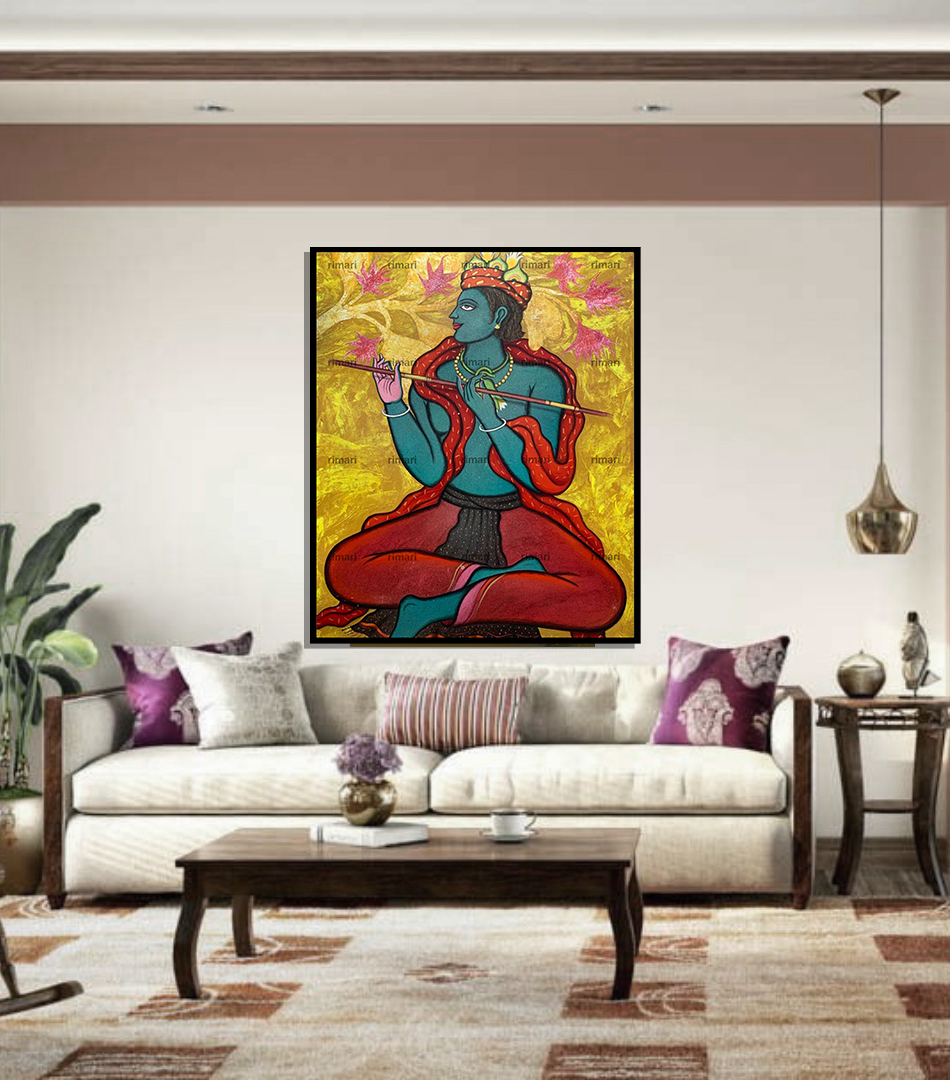 Traditional Indian Krishna painting done on canvas by Manas Bhoumik, depicting the scenes from life of Lord Krishna.